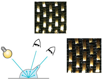 糸を組み合わせてできる布は、織り構造によって様々な意匠性を創りあげます。織構造は、手で触った時の風合いはもちろんテキスタイルから受ける色や光沢などの印象等に影響を与えます。たとえば布に光を当てると、見る角度によって模様の変化が現れることがあります。変角分光測色システムを使用して、光の入射角度、受光角度を変え、さらに布を面内回転させて反射率(L*)を測定すると、見る角度による模様の変化を定量化できる場合があります。得られたデータは光の反射を利用した布の評価として、手触りに加えた布の付加価値の探索に利用できます。