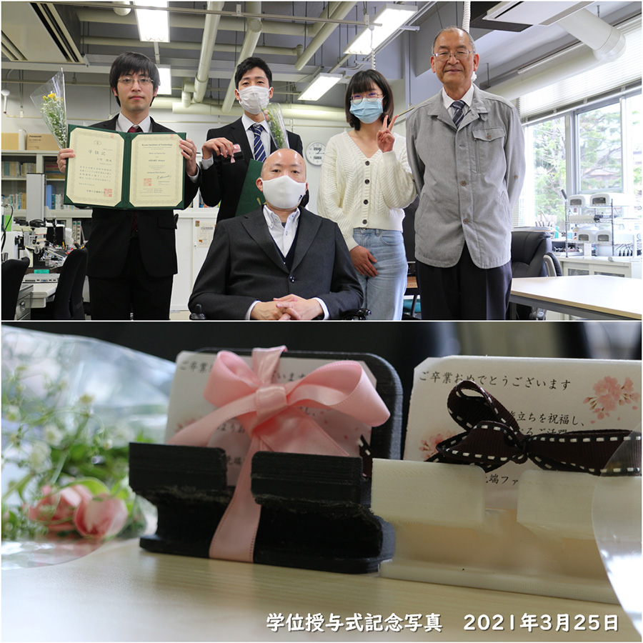 Even though we did not have enough time for research this year due to the corona disaster, the two M2 students did a great job in organizing their research. Thank you very much for your hard work, and I look forward to your future endeavors as you start your new careers in April! Please keep up the good work. And as a graduation present, Mr. Ogawa, our research assistant, made a 3D printed "glasses and phone stand" (made of 100% eco-friendly polylactic acid). Thank you very much!